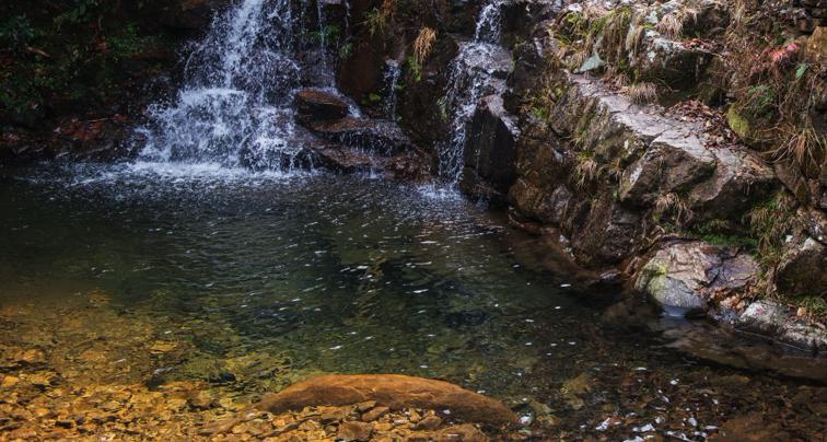 水流沿着岩壁流下,在低洼处形成一个小水潭。而水异常的清澈,一眼就能望到水潭底。潭底大大小小的石块都清晰可见。还能看到水面泛起的波波涟漪。