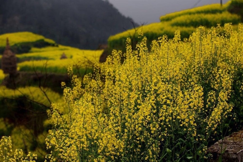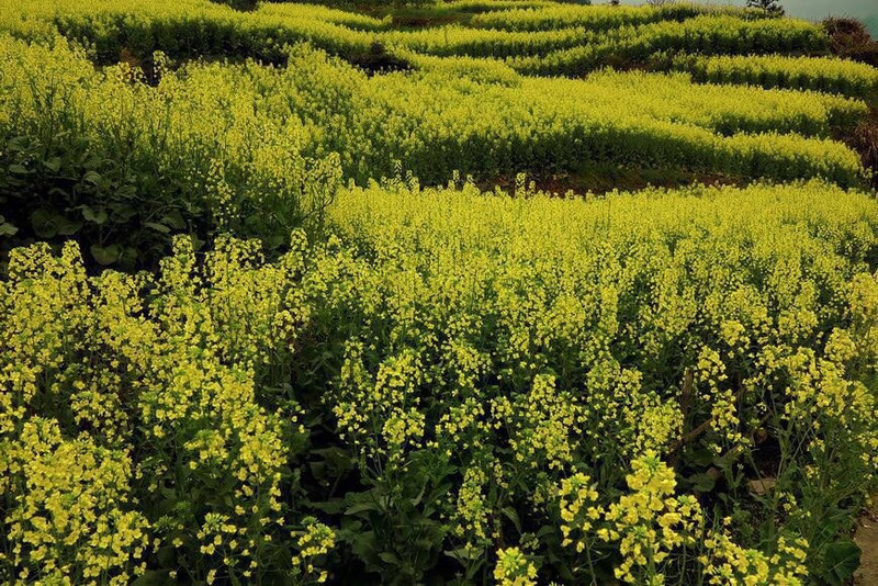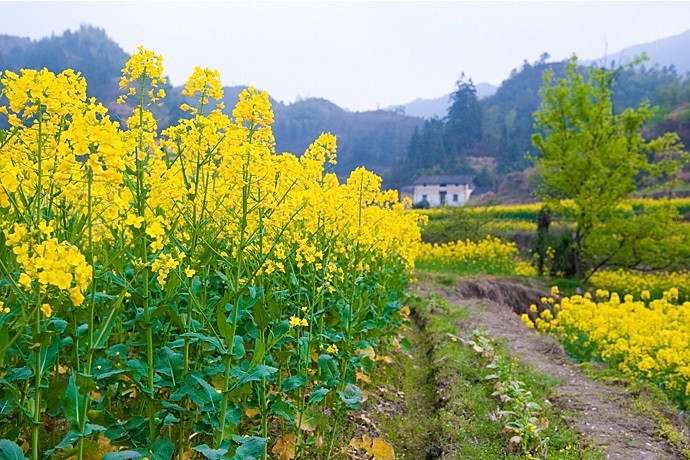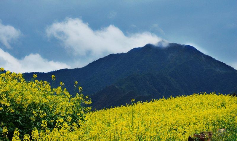 沿着山间小路攀行,那遥远的山的那边,我才发现,油菜花长势及高,逐级而上,皆快长到山顶。抬起头,便是一片云雾缭绕。云围绕着山峦,油菜花萦绕着山坡,这里很是清幽,只能听到山间的鸟欢快的鸣叫。真想爬上云雾缭绕的山坡,站在山顶吹着风,俯瞰人间四月。
