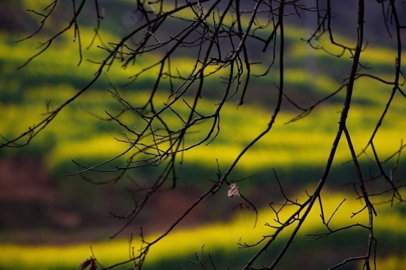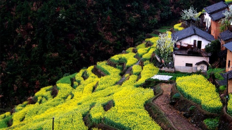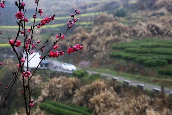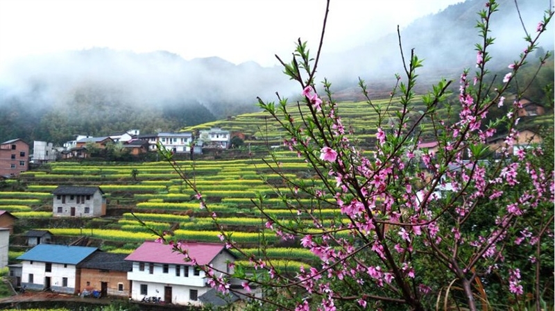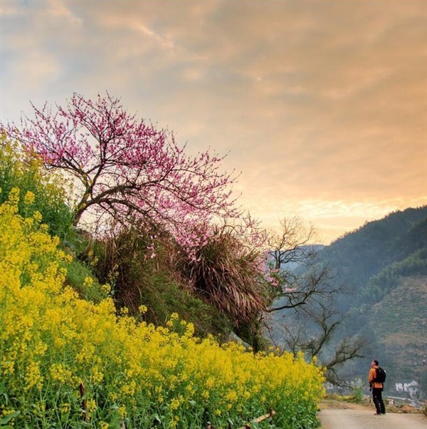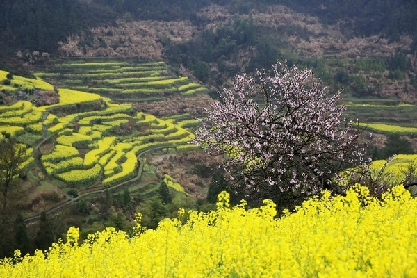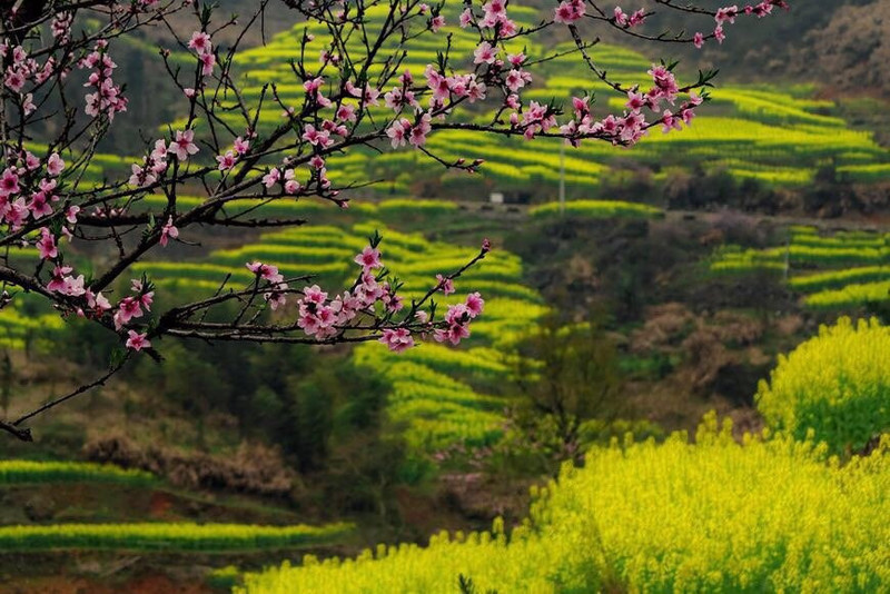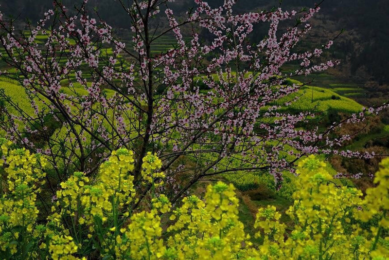 在往深山里走,便又是见到几处人家,油菜花一直萦绕着屋前屋后。小屋皆坐落在山腰,往下看,油菜花层梯田的模样一点点弥漫开来,夹着者点点绿色。在高一点的地方,在层峦叠翠的油菜花田中,也散落着几株桃花树。桃花伸展着枝叶,因其树高于油菜花,倒是一眼便看到万朵油菜花中的一抹红艳。倒是也几分迷人,几分秀色。朵朵粉红点缀在一片金黄中,仿佛给油菜花润了色。透过桃枝,远处云雾缭绕,底下皆是坐落户。仿佛住在这里的人们都是避世的隐者,远离尘世的纷争,坐拥这片世外桃源。大隐隐于市便是如此吧。