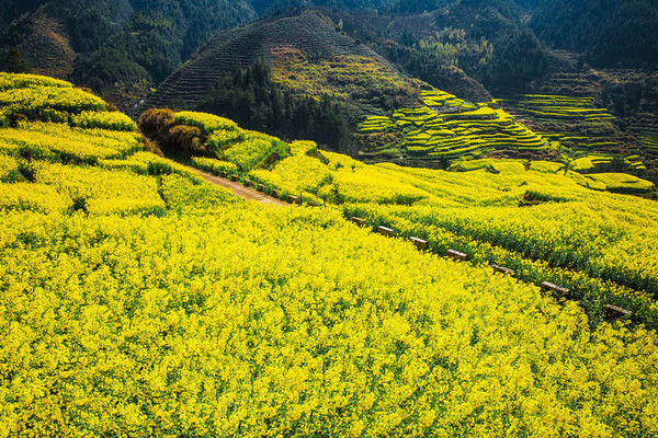 车开一个小时,便抵达了大龙山。一路上看到的都是辛绿,突至大龙山,放眼望去,满眼皆是金黄一片。黄色的梯田里布满了金黄色的油菜花,从山脚层层叠叠,扶摇而上直至山顶,错落有致的向我们展开来。若是说冬日里它还在沉睡,许是这一湾柔情浅浅的春风,用它的温柔备至的关怀唤醒了满园春色。万物复苏,花开万里,至上而下,绵延不绝。你站在大片的油菜花前,你却发现怎么也望不到边,那无边无际的花海,生生不息的绵延到山的那边。它们像极了一幅幅平行展开的油画,一排排错落有致的在梯田里摆开来。