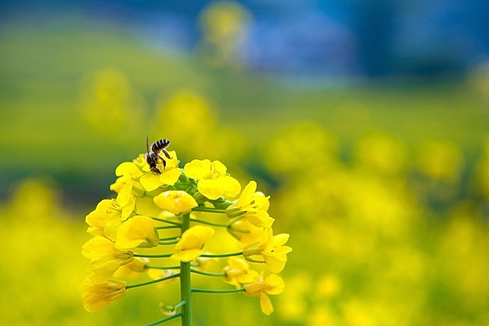 和煦的微风吹过,激起千层浪,朵朵黄花在微风中摇曳生辉,仿佛在风中跳舞。我在花中行走,忍不住伸手去触碰。油菜花,花开一株,每一株上又长着五六朵小花,相互扶持,相互共勉,才成成长成一株完整的油菜花。若只是看一单株,平淡无奇,待到花开满园,却甚为惊艳。若是你凑近一闻,一阵清香扑鼻而来,花香很淡,却沁人心脾。没有玫瑰般浓烈,闻着却是最为舒服。与我共赏这繁花似锦的还有一位辛勤劳作的园丁,便是这采蜜的蜜蜂。它挥动着小翅膀在花间飞舞。忙碌着采花酿蜜的幸福。朵朵清香淡淡散开,引来的还有美丽的蝴蝶,蝶恋花,依依不舍。在花间飞转跳跃,在落在花上小憩。