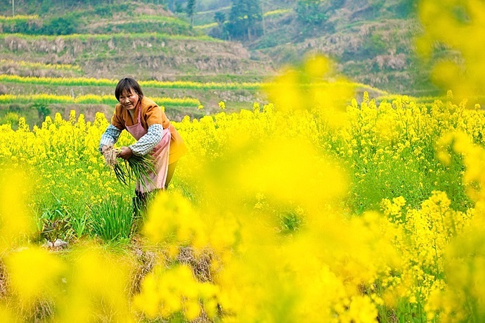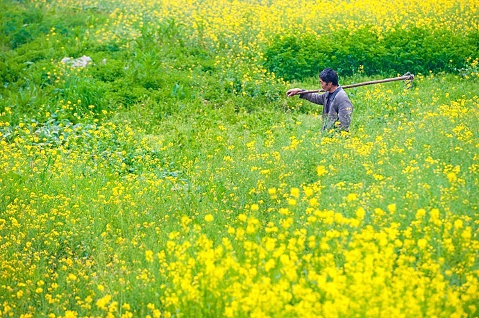也曾见到那些穿梭在油菜花里忙碌的身影。那个肩扛锄头从花田里走过的身影,那个身着围裙在田里忙着摘菜的身影。时光虽好,生活却总是围着柴米油盐,他们辛苦劳作才能撑起一个家,为家人撑起一片蓝天。最值得敬畏的便是这些田间地头里挥洒着汗水却仍然努力拼搏的人们。