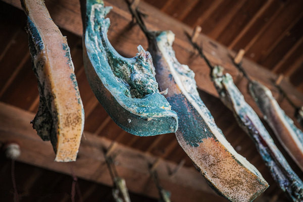 我沿着曲折的乡间小路行走至一户人家门前,门口的悬梁下挂着几块风干的猪,肉身干瘪无力,外延皆是长了绿色的霉菌。仿佛经过了很长的岁月洗礼,像一个久经沧桑的老人。在诉说者如歌的岁月。我站在梁下望了很久,别人告诉我这种肉只有通过这样的处理方式,待到食用时,在去洗净表面的霉菌,便是一盘上好的美味佳肴。看着眼前的这堆肉,实在无法想象出它能如何烹制成一道美味。