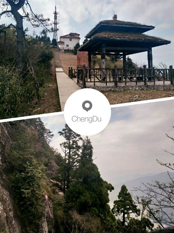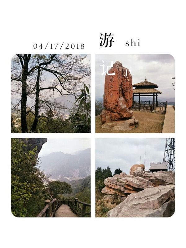 我想这应该便是山顶了吧。终于到了。离我最近的便是路边的茅草亭,用细细的栏杆围着。亭子中间还有一块黄红色的大石头上刻敕木山三个大字。石块底下的石头形状如同一只巨大无比的手拖住了这块大石头。