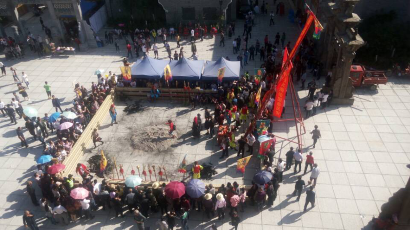 我还不知道前面到底发生了什么,但是人总有一颗想凑热闹的心,这一点是毋庸置疑的。我看到里面有个身着道袍的男子,还有四个包着头巾拿着冷兵器士卒打扮模样的人。他们身后是一个小小的祭坛,上面摆了些贡品,中间那个硕大的猪头特别显眼。地上一堆青砖被埋在一堆炭火底下,火已经熄灭,还在冒着几缕青烟。