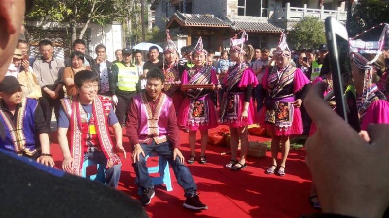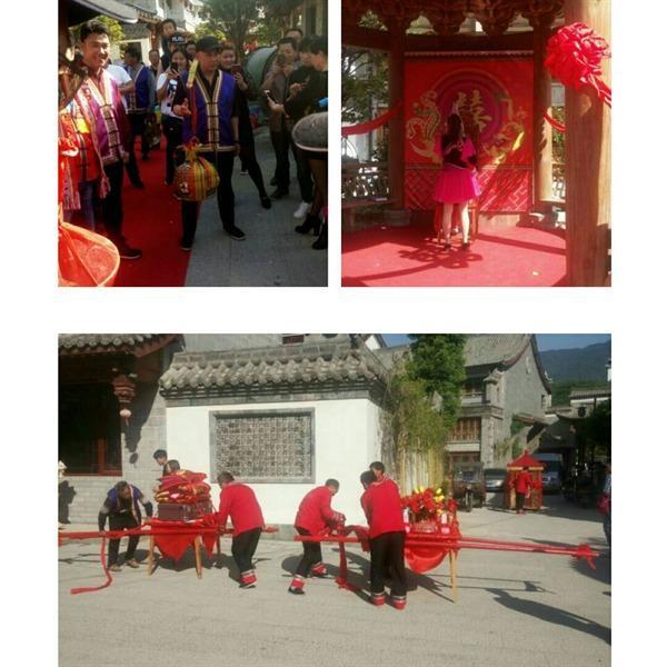 通过考验后,伴娘团在对新郎进行考验。需要以对歌的形式对上伴娘的歌。新郎五音不全的歌声引得众人一阵嬉笑,大家都沉浸在一阵欢声笑语中。经过了层层考验,总算得到了伴娘跟大舅子的认可。接下来就是大舅子抱着新娘过了桥,然后新郎坐上了那种架椅,底下由轿夫抬着,新娘坐在轿子里。我跟随着人群紧跟迎新队伍的步伐。不过人实在太多了,瞬间他们便淹没在人群里,我看不到,跟着人群绕了一圈回到了新娘家,由新郎抱着新娘,接下来便拜了天地才算礼成。这个时候游客们还没有尽兴,一直拉着新郎跟新娘不让他们走,纷纷表示要拍照留念。过了好一会,人群才散去。