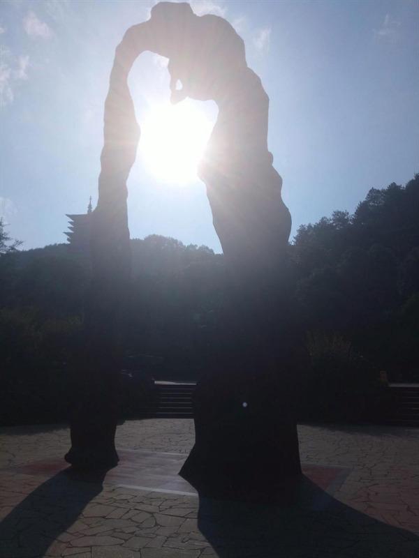 在网上匆忙购票,经过大巴车的辗转,终于到了我今日来一直想到的地方——根宫佛国。单凭立在入口的那一座巨大石碑,我就确信不虚此行,因为石头上面用行书遒劲地写了几个大字:“根宫佛国游玩景区”,掩映在丛丛树叶之中。是了,这本是以根雕为名,根雕出于根,根出于树,其二者本是同源,如此掩映之中,另有一番滋味。