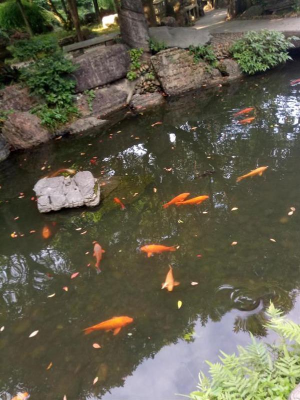 复下寻路,遇一潭,潭水极清,潭面光滑无纹,偶或风吹过,方才泛起涟漪。几尾鲤鱼忽的转身,身姿窈窕灵活,正是鲜活的橙红,倏而躲到树荫底下,石块旁。复又游回到潭中心,作向上啄水状。想必这便是醉根潭了。醉根潭并非以一潭覆地,是有桥立于其上,桥两边各有红色锦鲤,相映成趣。