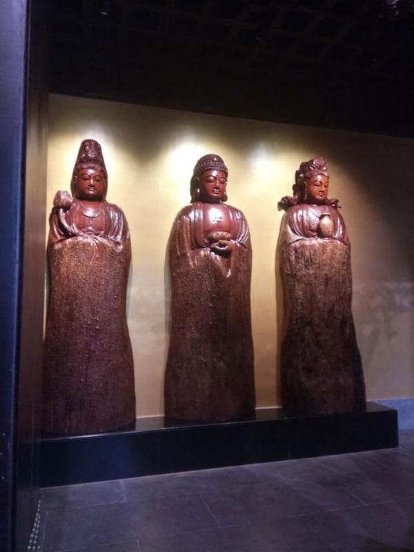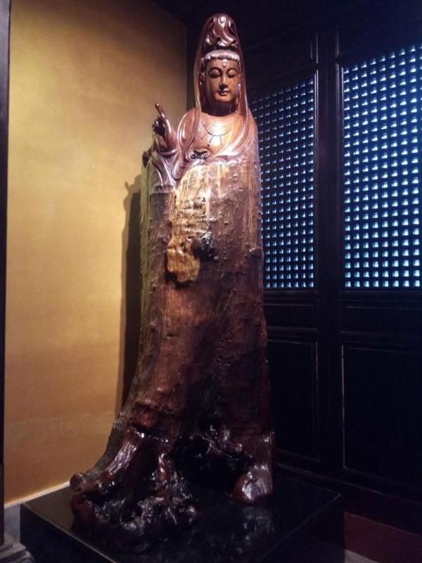 往前果真看到一座宝塔,高高的佛像凝固了他们的实体,仿若与香火钟声相伴,颇有几分佛法意味。正是看了面前的一大僧人,面容严肃,目光凛冽,端庄的立着,须仰头方可视其全貌该像全身三米有余,衣物花纹细节雕刻精心无比,体态匀称,气度不凡。望之自感沉着威仪赫赫。寺内四角各有一尊木佛,是否因可以吸收天地灵气,日月精华,故成此胎,不得而知。然觉若无其庇佑,人间又会是怎样一番乱象呵!思忖至此,仿佛心中有佛,自觉神态盈盈。