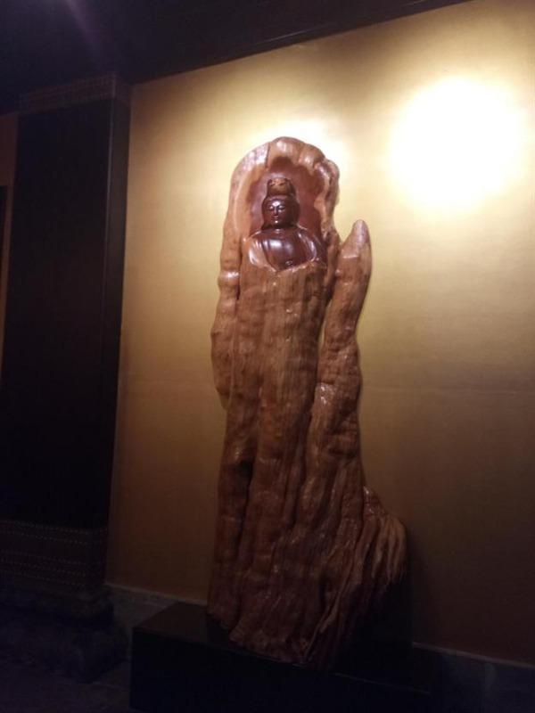 令人印象极深的是一个如烟雾形的木雕。走近才发现它是两面,左边飘入烟,右边却是一位佛家弟子正垂首低吟。