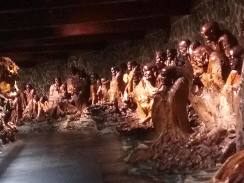 佛在我国本土历史悠久,自大唐西域传入中国以来,佛变成了一个精神象征。宋王安石曾说过“能了错缘如幻梦,世间唯有妙莲花。”或许所言非虚。这五百罗汉有站有坐,有笑有怒,有正睡亦有睿智目光神态者,其中形态不一,姿态万千,令人眼花缭乱,惊叹忘言。忽有一面目正对你眼神,却是目光沉沉,似在思索人间万千难事,一时竟不知身在何处。都说苦海无涯,这五百罗汉齐聚一堂,必也真受佛法锤炼吧。有衣裳不整者,坐地仰天大笑;有峨冠博带者,正对同门轻语;有面容光滑者,握一拐杖伛偻;有嶙峋者肋骨横生,依旧端端;有群众而笑者,有分坐而索者;有独立而缥缈乎人事者;亦有郑重如学究,无一时不皱眉这。等等如此,不一而足。一路走下,罗汉面目换将更换,却始终未见尽头。