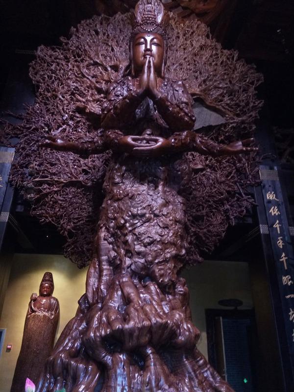 先是被其背后如错综盘绕的树根吸引,正疑惑哪座佛会有这般奇怪造型,待看到起伸出的双臂之后,才恍然大悟:“哦!千手观音!”这观音,面容温和,其外手内各有一眼。一对手相叠于腹处为守,其余竟有千手向外形成庞大的头冠,料想这必是一尊无所不能的神。此间黄光照其面容,令人恍惚以为真佛降临,仿佛他正对你呓语,讲述那可说又不可说的一切,曾深藏在时间的故事。东面千手观音,西面观世音,南北两面各有一尊。料想其为善之本原,必是天地间纯净经。忽然门外有铃音响起,格外清幽入耳,空旷幽绝。
