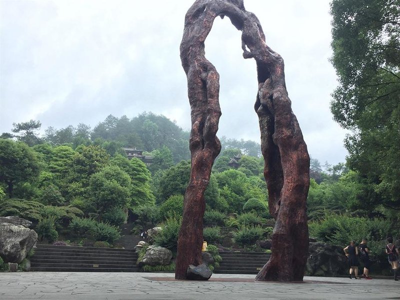 刚进入园子就能看到一座拱形门,高有五六米,名叫 “福门祥光”。由于个人比较喜欢研究生态系列,所以对于植物的形态就比较喜欢,尤其是亲眼见到植物的根部就有种莫名的喜欢,感觉像是回到了原始部落的感觉一样。本以为这个也是根雕艺术品之一,结果看了说明才知道这是由铜铁制作而成的,看起来十分古老,摸上去光滑冰凉。 这道拱形门高高伫立,据说还是一道祥瑞之门,从门下走过,便会有祥瑞附身呢!