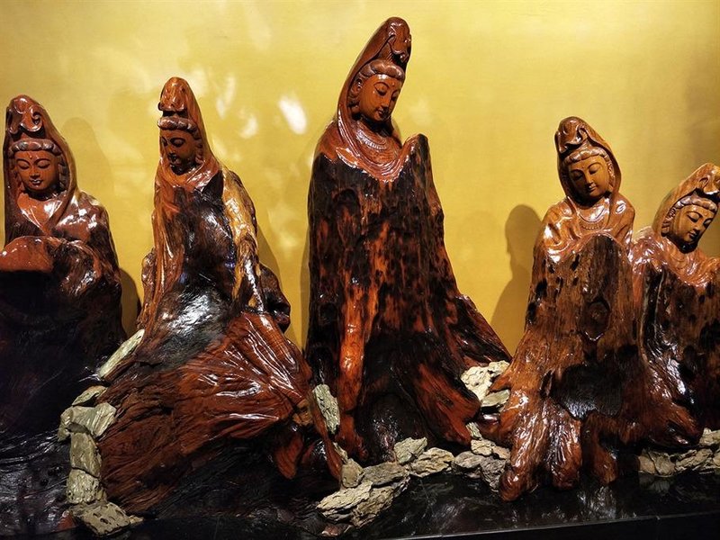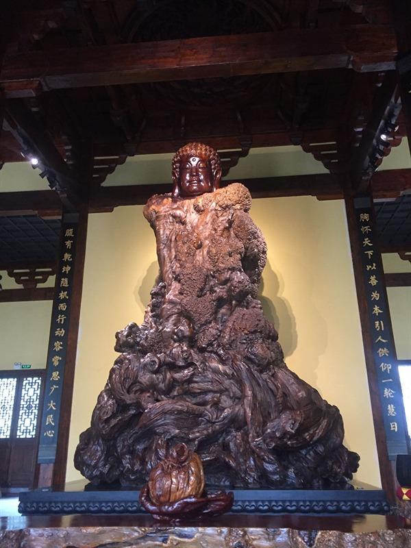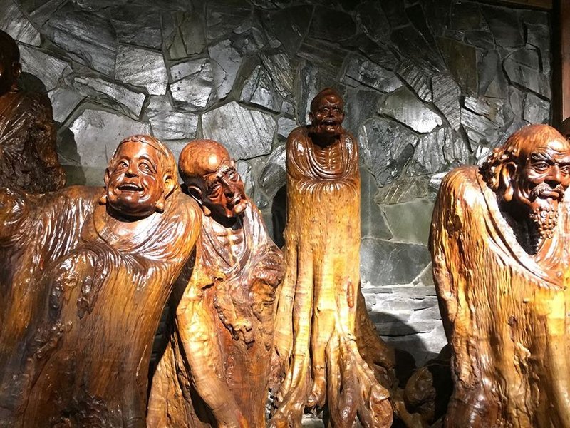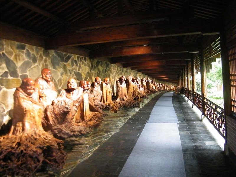 五百罗汉群,长度有六百多米,气势恢宏,浑厚古朴。徐谷青大师耗费十余年完成这一作品。五百罗汉神态各异,展现的是世间百态,芸芸众生,喜怒哀乐,尽在其中。佛像的头栩栩如生,而全身的写意的创作又显得十分富有艺术张力。不得不佩服这些根雕艺术家们的水平和艺术鉴赏,把完全写意加写实的手法运用的淋漓尽致。