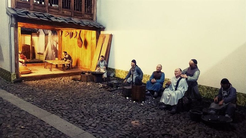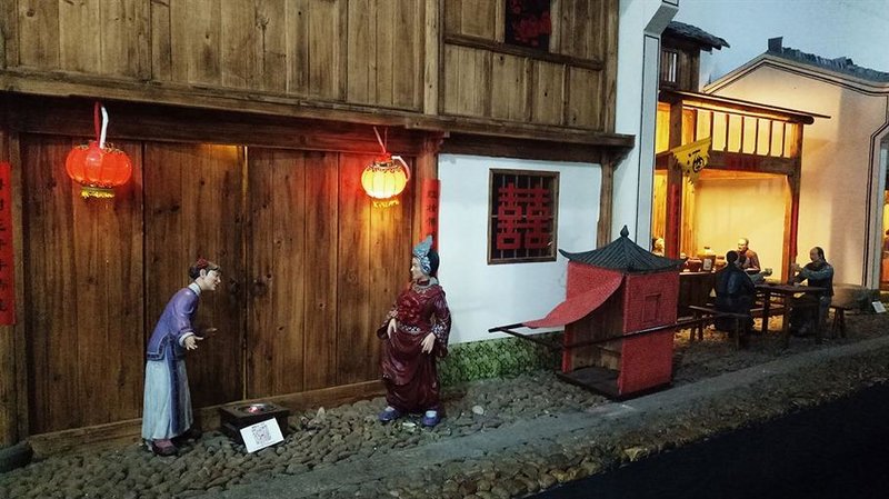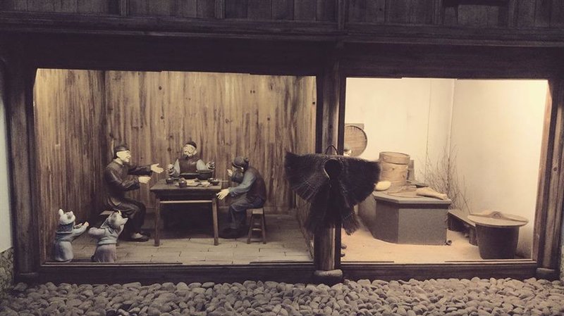 踏着木质楼梯上楼,噔噔的脚步声带着我们来到了历史长廊,领略从古代到现代的烧炭文化。一位红娘带着羞涩的新嫁娘跨过了炭盆,霉运随着炭火的燃烧而消失殆尽,开始了她的新人生。嫁为人妇的她,正在厨房忙碌着,她必须要在一家人回来之前准备好一桌可口的饭菜。烛火点起,一桌人在品尝菜色,孩子们在边上嬉戏玩耍,而厨房,只有她呆呆的坐着,唯有灶膛里时亮时暗的竹炭在陪伴着她,感受着她的无奈与忧伤。货郎挑着他的理发工具,沿街叫喊着理发,偶有年长者叫住他,他便展开挑担,往炭炉添上两块炭,只为有温水在他剪发之后能洗净沾染在客人身上的发屑。卖炭翁沿街叫卖,总会有一些家里富余之人光顾。在爱迪生发明电灯之后,烛火消失了,它身上留下两行烛泪证明着它的存在。大跃进时期,人们大炼钢铁,将能烧的木头都用尽,地上洒落着滚烫的木炭,没有人在乎它。