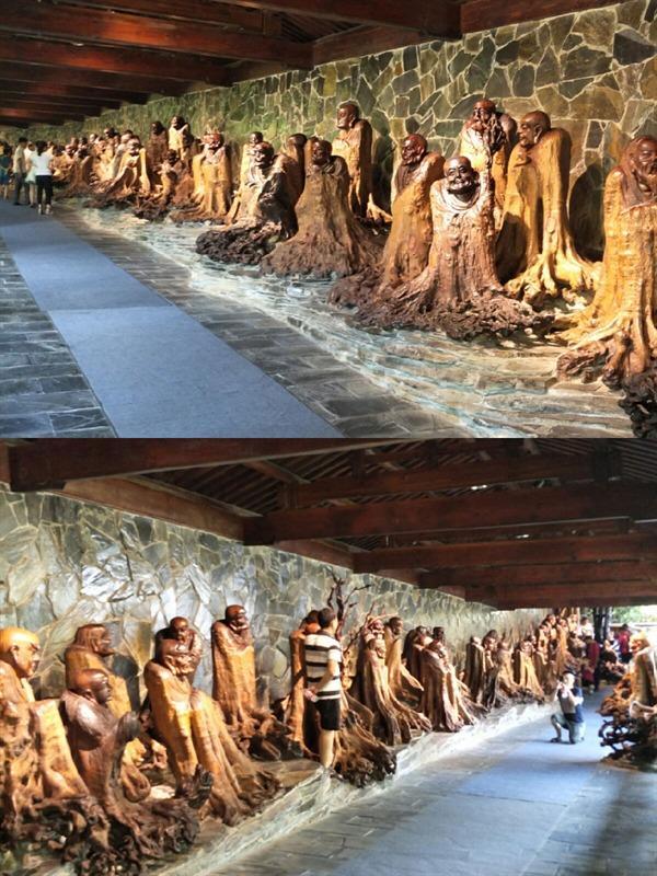 踏出大雄宝殿的门槛再向前走就能看到一条禅廊,它的特别之处就在于根雕艺术品镶嵌在特制的墙上,而且与庞大的佛像相比显得小巧极了。
