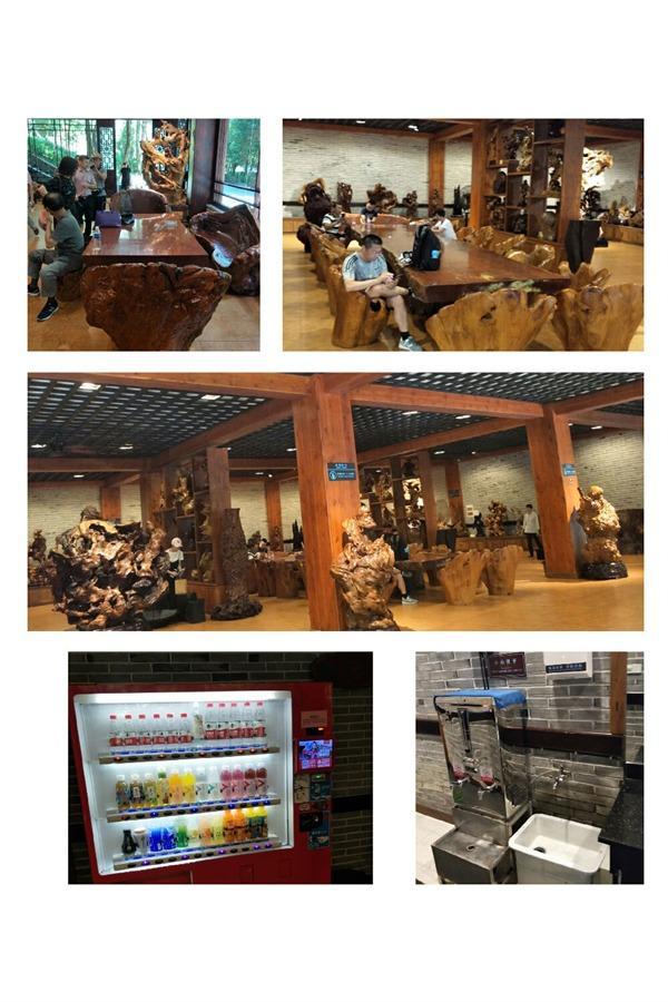 休息片刻后,我又顺着右边的石阶攀登而上,发现一个更适合休息的醉景楼游客体验馆内,竟然可以坐在根雕艺术品上休息!如果有带自己的水杯,甚至可以去指定地点接热水喝,当然馆内也有自动贩卖机,很是方便。