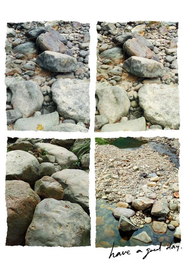 峡谷中还有裸露的大片溪滩,由大大小小造型各异的鹅卵石组成,颇为壮观。特别是那些大块的滩石,它们更像是暮年的老者,一副《菜根谭》里所说的“岁月本长,而忙者自促”的样子。它们极度包容,包容着溪水从它们底下穿流而过的身影,包容着我们从它们身上踏过的步伐,包容着风吹日晒......似乎世上的一切都能得到它们的眷恋和爱怜。