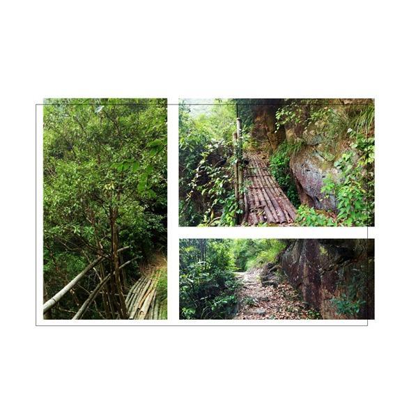 山间小路曲折婉转,铺满了枯黄的落叶,却留几簇碧绿的杂草冒出,显得格外的富有生气。路边斑驳的山崖或石壁上不时渗透着山水,点缀着泛荧光的青苔。一些被山势断绝的山路,人为的用竹子搭建了简易的栈桥,勉强连通出一条路来。栈桥的栏杆缠绕着藤蔓,让栈桥与这里和谐的融为了一体,也许这里是容不下一点儿过于人为的物件吧,不然便显得与这山水突兀了。走上这摇摇晃晃的栈桥,那可要收收自己惬意的心了,生怕自己一不小心就落下山崖,去和溪水来个亲密接触了。
