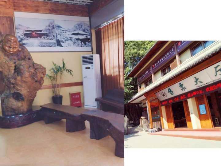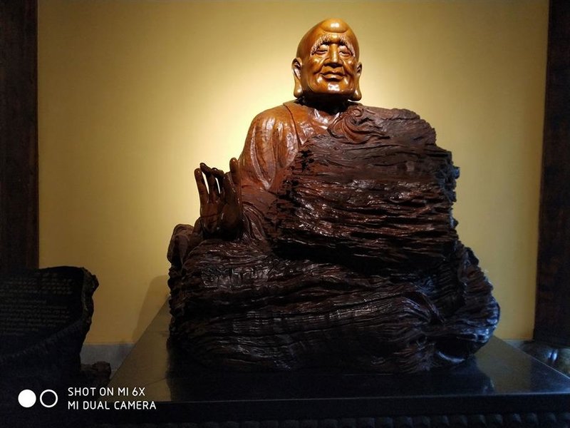 走进售票厅后,内部的程设深深地吸引了我。棕黄色的釉木长椅,一看便是一个精美的根雕作品。不仅是长椅,厅内的桌子.茶几皆是如此,在一条长凳旁还立有一尊喜笑颜开的佛像,亲切而喜庆,这样的装饰仿佛是在向游客强调这里根宫佛国的身份与地位。而淡淡的木香轻轻的拭去了游客内心的浮躁与劳累,让一切都变得轻松起来。
