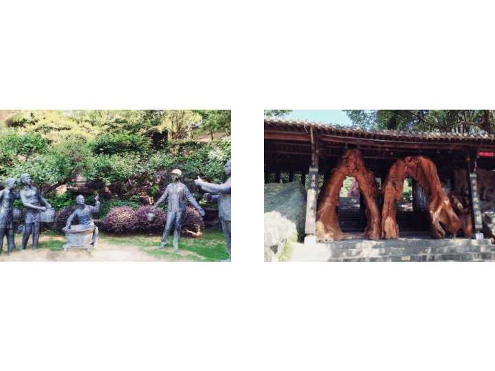 刚入门内,两座巨大的拱形根雕毅然挺立于门前,宛如两个威武雄壮的猛士守护着这方净土,再向前走几步,几尊铜像便闯入眼帘,一位红军领袖竖起大拇指,给正在工作的劳动人民点赞,而那位正在揉面团的劳动人民则憨厚地摇了摇手,仿佛在谦虚些什么。简单而纯粹的几尊铜像,将开化劳动人民的勤劳淳朴展现的淋漓尽致,给游客一种亲切而踏实的归属感。