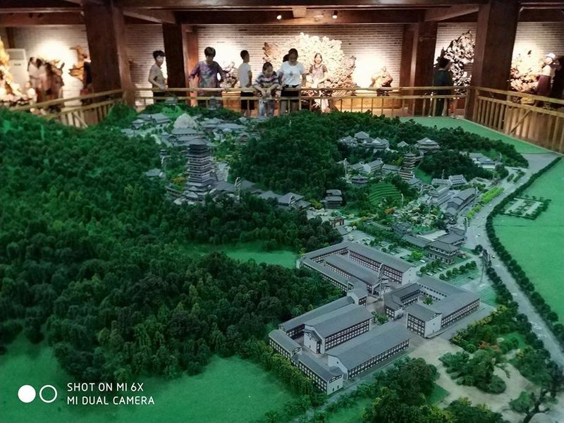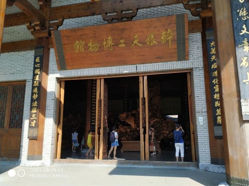 往前走不远,醉根天宫博物馆几个大字映入眼帘,这是座唐汉风韵的仿古建筑,外观以象征佛教的莲花雕塑居中升起、层叠出挑,花开佛来之意;前檐形成“合”形平台,烘托“天人合一”的构思主题。里面的根雕非常的宏伟大气,顶层是个多功能文化展厅,还有各地根雕大师不定期的作品展。在这个充斥着根雕艺术与佛文化的博物馆,游客可以完全沉浸在浓浓的木香中,暂时抛开生活中的一切烦恼,跟随着艺术大师的脚步,陶冶自己的情操,与千万尊佛像一起,为未来祈祷。