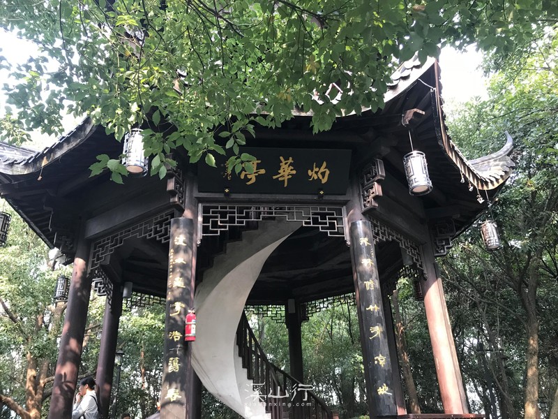 走下山来是虎山水库,虎山水库就是一个大湖,湖面碧波荡漾,山水一色,绕湖的游步道用石板铺设,中间建有几个亭台楼阁。水库和虎山相连,虎山顶建一亭子,名曰,“灼华亭”灼灼华华,光彩明亮。