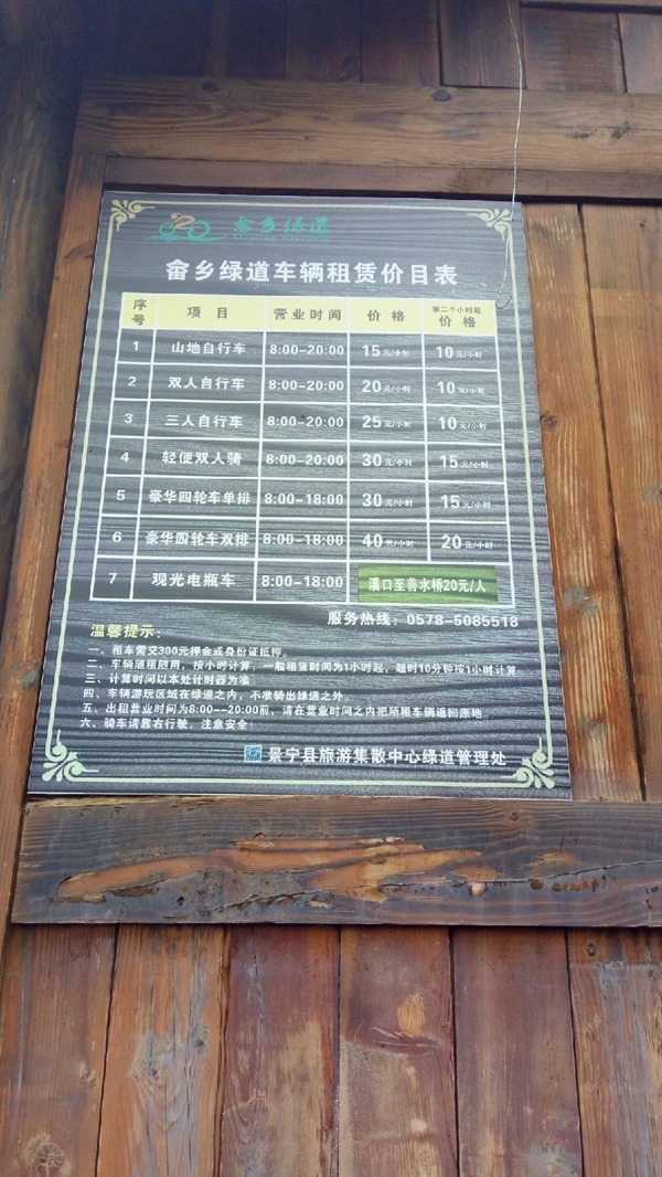 旅游小贴士:1、注意提前注意天气情况,像这种老是下雨的秋天最好带把雨伞。2、注意骑行时间,而且自行车到了终点是不能还的只能回到终点,因此,时间较紧张的朋友建议最好选择一段进行游览。3、记得带零钱。4、记得带充电设备,拍照还是很费电的。5、记得穿戴舒适,特别是鞋子,不然真的会脚疼。6、沿途没有小店,因此带好充足的水和充饥的食物,不过善水桥上有自动售卖机,就是样式较少。