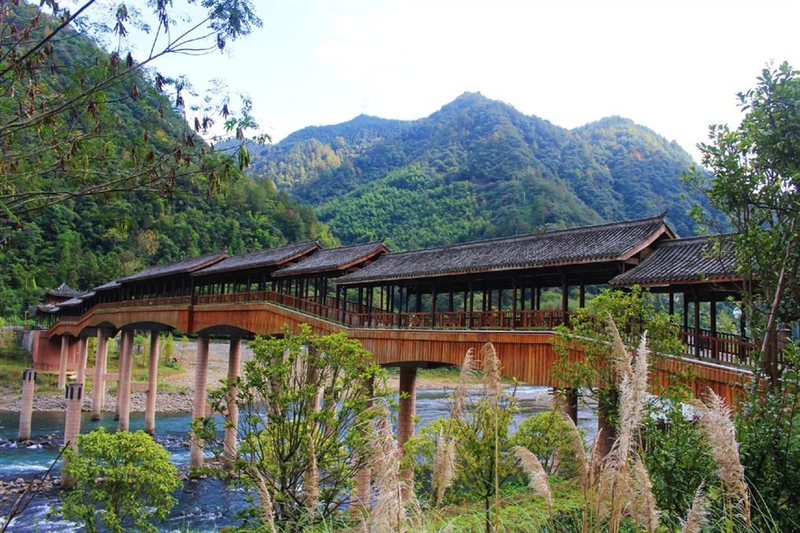 但秋色最浓的还要算善水桥的那一段。善水桥是这绿道上唯一的一座廊桥,廊桥气势庞大,让我过目不忘,它像是一条巨龙横卧在溪水上,棕红的色彩,使其在两岸青山的照应下更是艳丽。走在桥上,像是穿梭在时空一般,仿佛桥的那头有另一个时空在等我,在古朴的事物面前,人总是有很强的年代代入感的。
