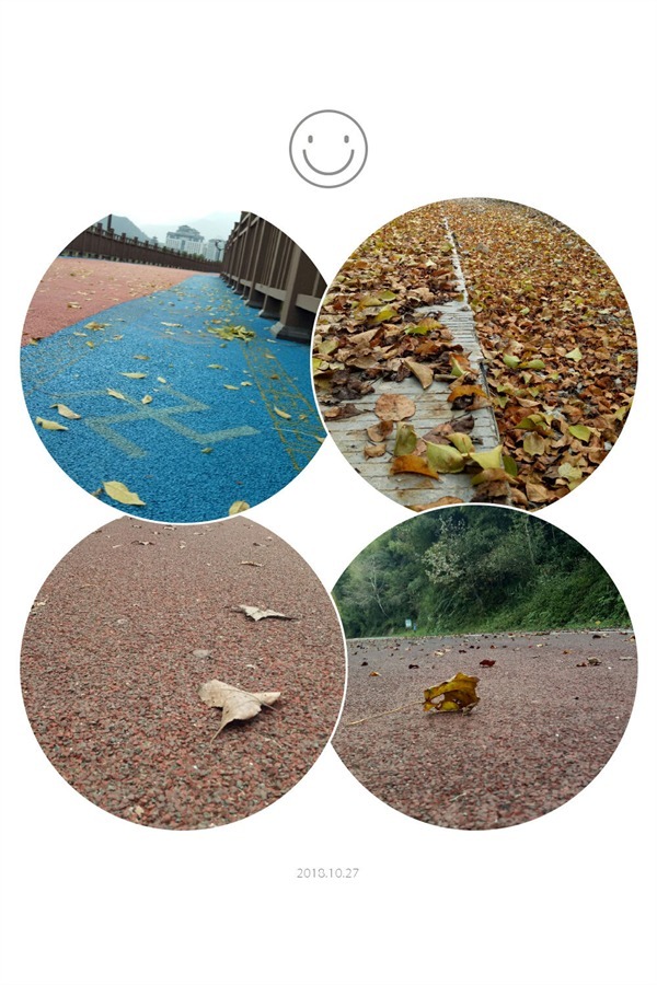 既然是秋天,怎么可能会没有落叶呢?不然怎么会有落红不是无情物的传唱。绿道上也飘落着各色各样的落叶。有的刚离开大树,在空中转了几圈,便悠悠的落下,轻轻的伏在绿道上。有的早已经躺在了地面上,又随着微风在空中窜了几下,便像是没有力气一般的躺在绿道上了。但是它们倒是给悠长的绿道又重新增添了色彩,也使得绿道这条彩带的样式更加繁多。可是啊,突然在这秋色里又可怜起地上孤独的落叶起来,等待它们的只剩被时间慢慢的磨蚀。《秋天随想》里就有这么说“如果我是一片残叶,我会思念,深爱的枝条,直到苍老,或甚至腐烂。”