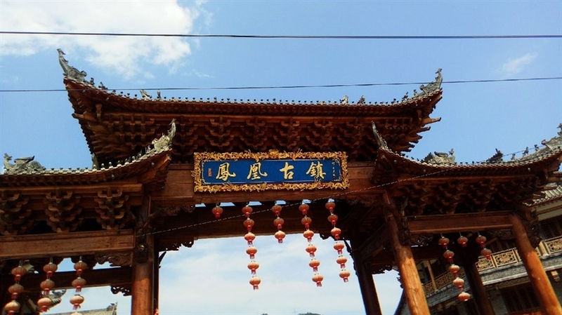 古镇的大门是一个高大的牌坊,为中国传统的斗拱式结构,但跟我们汉族不同的是,这个牌坊的屋顶上的图案为畲族的图腾——凤凰,连上翘的屋檐也都是凤凰的造型,极具民族特色。今天早上的天气还不错,露出了久违的太阳,显得楼宇格外辉煌。