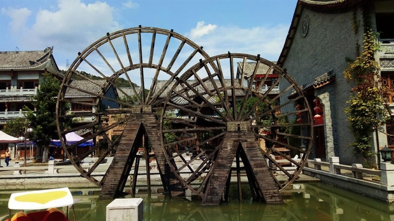 再往里走,便看见了两个大水车,好像很多具有民族特色的地方,都会修建这样的大水车。两个水车相互依偎着,立在水中,水里的鱼儿不时在它们下面穿梭嬉戏着。