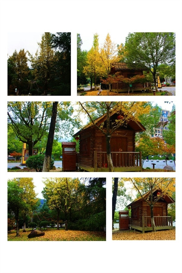现在已经是深秋,博物馆外的银杏树已经披上了金装,秋风阵阵,叶子离开母体,像一只只美丽的蝴蝶在空中飘荡着,盘旋着,舞动着。风停了,叶子又慢悠悠地、轻轻地、静悄悄地落到了地上,此时地上的落叶越积越多,像是给草坪铺上了一层金灿灿的被子。有的落到了树下的小木屋上,屋顶也散落着一层金灿灿的叶子,使得小木屋也格外精致起来。