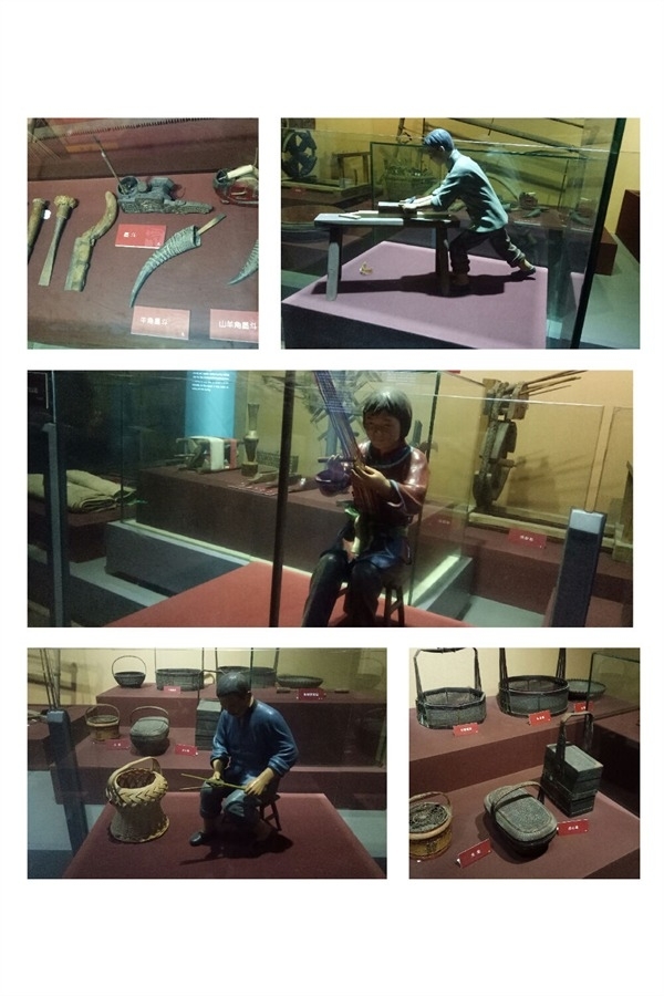 然后是畲族的一些传统工艺,如畲族姑娘们编制的花带,畲族木匠的工具,畲族竹篾技艺等等。博物馆不但展现了成品,还用小泥人还原了匠人们制作时的场景,给我们生动形象的展示了这些技艺是如何操作的。