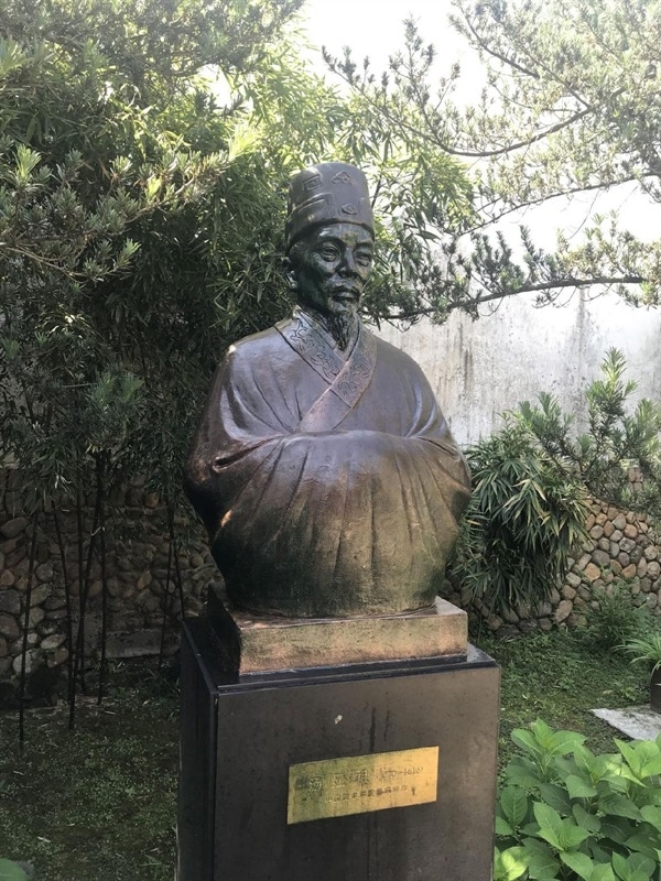 院子里的八仙花丛里有着汤显祖塑像,这个号称“东方莎士比亚”的剧作家,在遂昌兴学重教,清廉正直,勤政惠民,赢得了百姓的爱戴,更留下了“平昌遗爱”的美名。