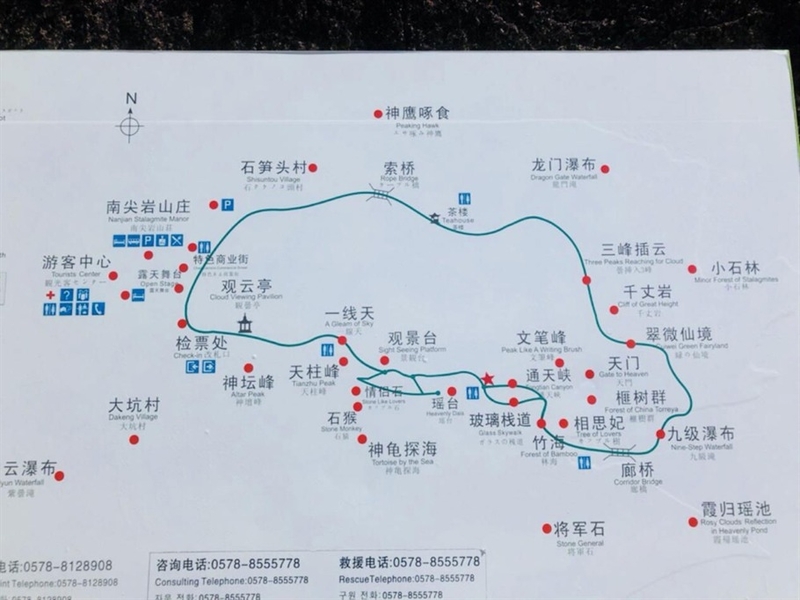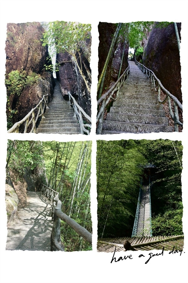 当然南尖岩的玻璃栈道也是一大亮点,在陡峭的石壁上,有一段玻璃铺就的路面,说惊险也真真是惊险,恐高之人怕是要受苦头了。但是踩着玻璃,透着过玻璃可以清晰的看见脚下的竹林随着微风不停摇曳形成了不停翻动的竹海。身外又是极为开阔的山景,真如飘在云端之上,简直妙不可言。而远远望去的两山之间更是有一条长长的玻璃索道可以挑战。索道上透明的玻璃在阳光下反着耀眼的光,像是《冰雪奇缘》里冰雪女王为自己建造的冰雪世界里的栈桥。走在上面,当真是飘飘欲仙。