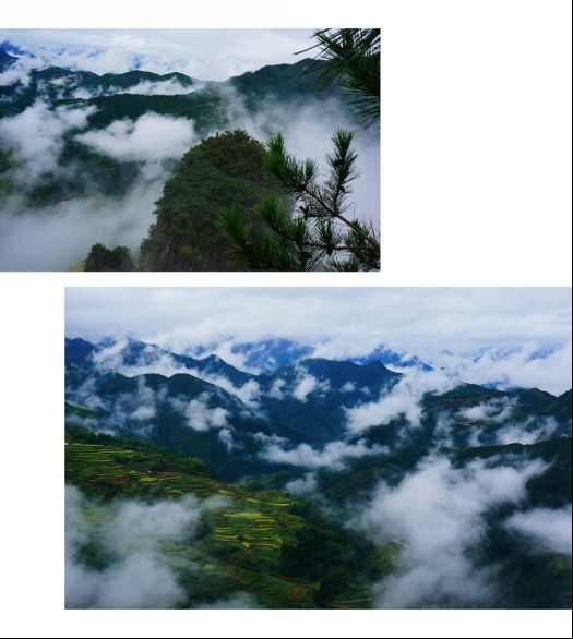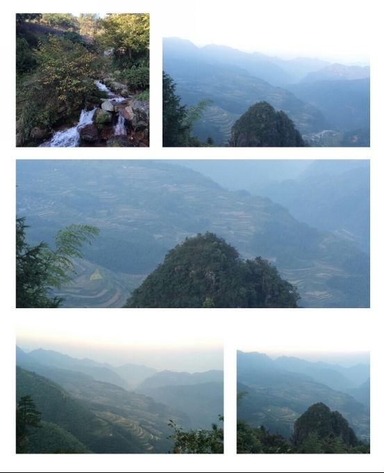 今天的能见度不是特变好,远处群山如黛,能够看到山坡上的的农田随着山势起伏,层层叠叠,错落有致,形状各异,每块梯田都呈现出不一样的色彩,远远望去如一整块蜀锦,豪华艳丽,气势磅礴。