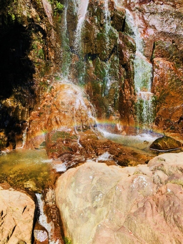 细细的山水伴随着哗哗声落下,跌落在瀑布底下的石头上,一部分有沿着石头流进小石潭里,在石潭里打了个滚儿,又欢快的奔流而去。而另一部分,激起细小的水花飞向天空,形成水雾,在阳光下产生了奇妙的变化,摇身一变竟然形成了彩虹,正所谓“尘心古难洗,瀑布垂秋虹”。彩虹随着水雾不停的跃动,散发出色彩斑斓的光芒,极为梦幻。