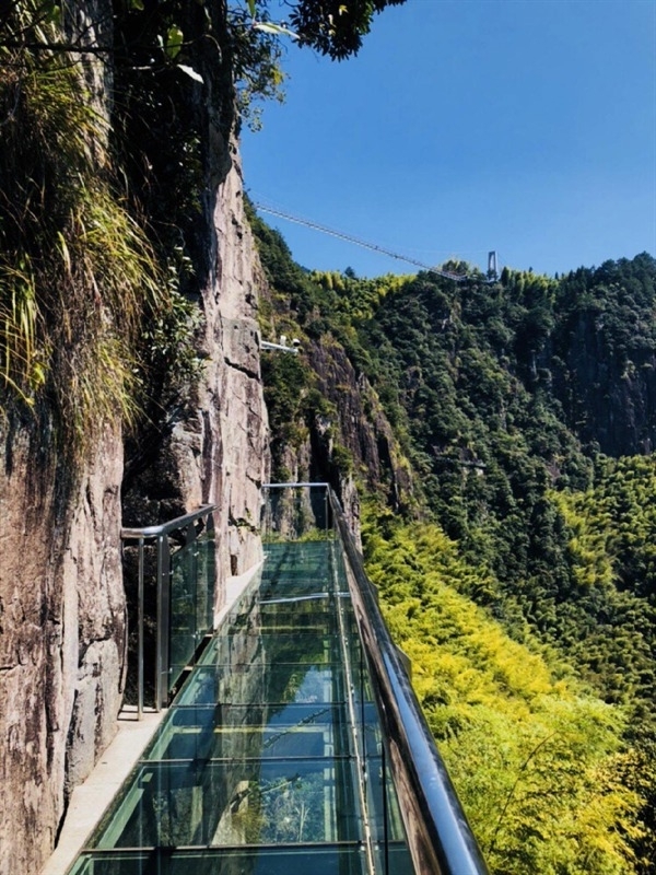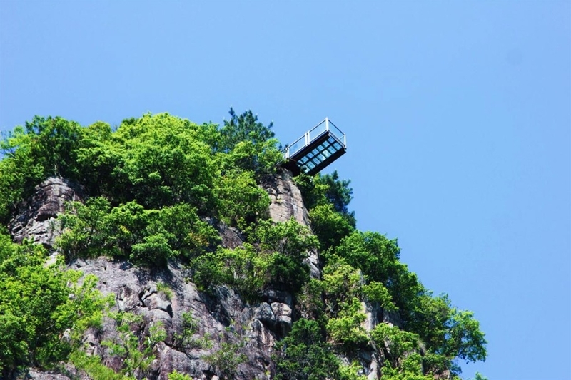 沿着山间栈道向上,抬头望去,有一个突出山体的玻璃铺就的观景台,它孤零零的在那儿,被山体植被的翠绿围绕,阳光甚好,蓝天映衬,只能用极美二字方可形容了。