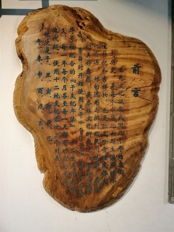 进门往右走,是十二生肖文化长廊,我在这里逗留了很久。朋友说这些作品是用香樟树根制作而成。香樟有一种古老而神秘的味道,我每每闻到总会觉得内心安宁。长廊上摆放着香樟根的切片,上面刻录了关于十二生肖的故事。还有十二生肖的来历以及中国汉字八体书法的演变,我实在太喜欢这种带有历史沉淀感的作品,被时光慢慢打磨,散发着属于自己的光芒。