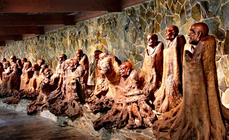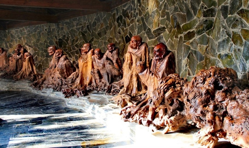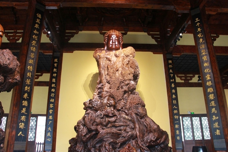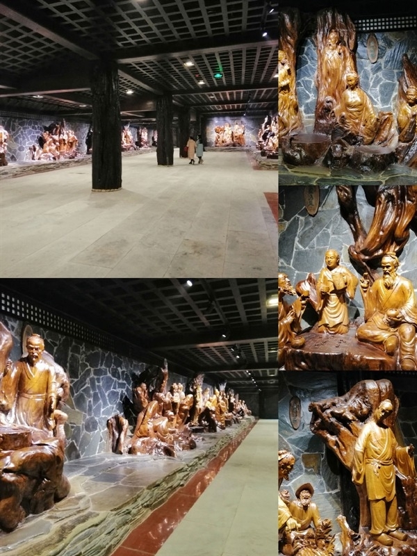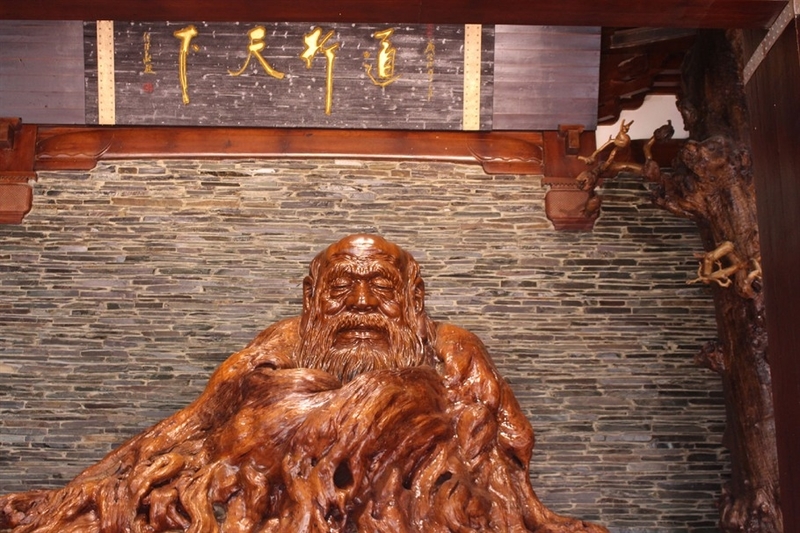 博物馆总有三幢大殿组成,其中第一座大殿为“道行天下”,负一楼以《道德为经》主题创作了八十一组根雕群,阵势恢宏,形象的展示了老子的哲学思想;一楼为巨型根艺“老子”造像、老子生平以及诸子论道等二十四组群雕,选取先秦诸子百家十位最具代表性的人物,展现其思想及学说;二楼为“万世师表”为主题的儒家思想大型根雕系列,展示了儒家文化思想精髓;三楼为儒家和道家文化学术交流中心。可惜此次只对游客开放了一楼与负一楼。