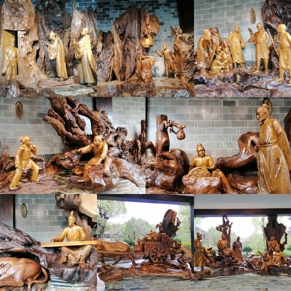 第三座大殿为“民俗文化馆”,陈列以56个民族系列、中华孝文化系列、民间故事、山海经、成语故事为题材的大型根雕艺术作品。天官赐福等大型艺术作品。