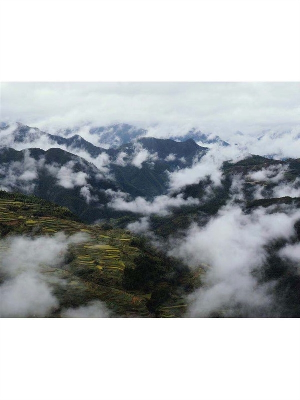 我回头一看,只见远方云雾缭绕,山峦叠翠,像是站在半空中,山岭迷迷茫茫,举目顾盼,千山万壑像无数只飞蛾翻飞抖动,天地瞬间融为一体,灰白色的美得不可方物,这是南尖岩给予我无限的思绪,理不清,很神秘,和这里的群山一般若隐若现,加上朦胧的大雾,造就了这深秋的彩锦。山中鸟雀很少,幽静的山谷只能听到远处宏伟的瀑布声,只留下了无限的遐想与向往……