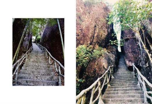 什么一线天,什么百丈峡。还未见其面,就已闻风丧胆,高不可测,穿云深处。这里藤蔓丛生,那些油麻藤看上去比碗口还粗,横纵交错,满是雍容华贵,不攀如此极高之峰,又怎能做到“会当凌绝顶,一览众山小”。宽度大约不足两米,双壁对立相峙。峭壁林峰,这里的树都是倒挂的,此时阳光从上方一射而下,千丝万缕的光线倒映在峭石上,变幻多端,色彩斑斓。与其它处不同的一线天相比,脚下不是自然形成的绝壁小路,没有那么慌张,阶梯状的石路层层递进,旁边的栅栏在此闲置,为这里的游客带去安全感。显得那么可爱……