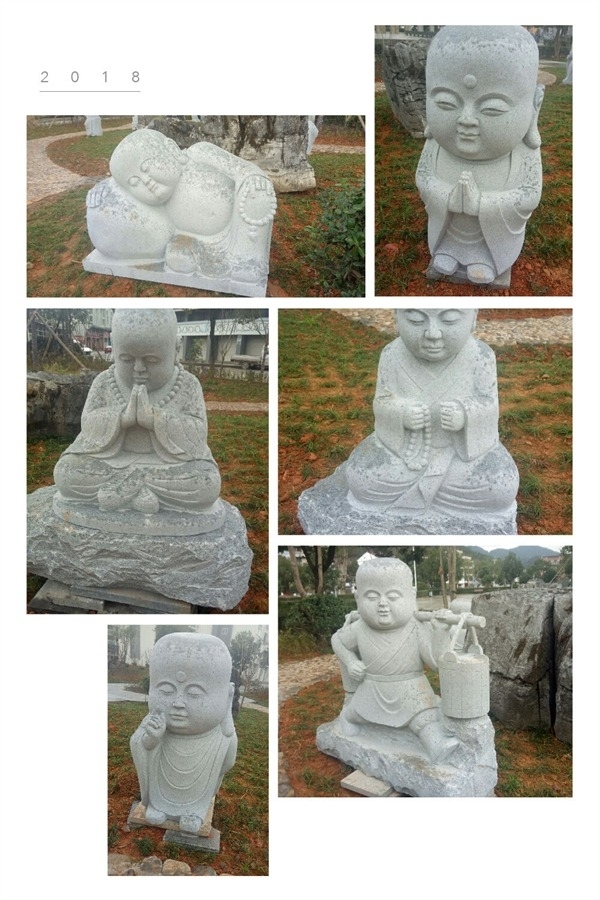 寺院外面有一个说大不大说小也不小的园子,除了植被花卉之外,还有憨态可掬的小和尚的石雕佛像。它们一改往日严肃的风格,圆圆大大的脑袋占了身体很大一部分,有的挑水,有的双手合实在念经,有的在练舞,还有的靠着石头打瞌睡,可爱的简直想上去摸摸它们的圆圆的脑袋了。