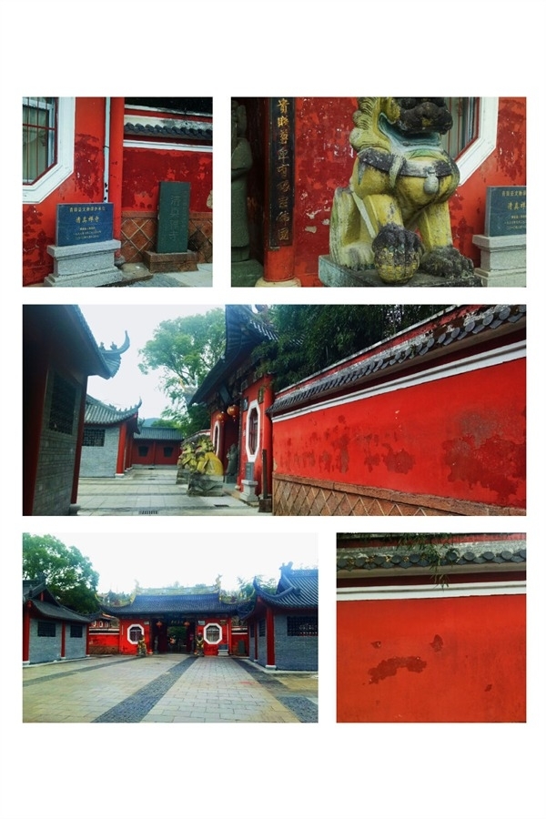 真正的山门是红色的围墙,这也是寺院最先的山门。门两侧为一对石狮子,狮子上已经敷上一层翠绿色的青苔,微微还泛着点荧光。屋正梁上正对着大门的是八仙过海砖雕,两边飞檐上还站着不同的仙人,飞檐的顶端是摆动的龙尾巴,这些都漆着亮丽的色彩,精美异常。