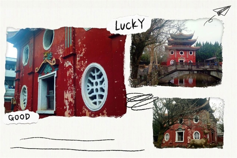 一进正门,是一个放生池,池子中间有一座石桥,池子两边分别是红色的钟楼和鼓楼。它们相互对应,也是中国传统寺院中的一种建筑方式。刚才在门外听见的钟声就来自于这里。两座楼的三层飞檐高高翘起,窗户为白色圆洞状,像是《西游记》里孙悟空变的那座小庙。外墙体的红色墙面已经微微剥落,看得出浓浓的岁月痕迹。