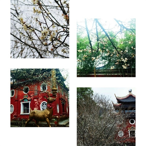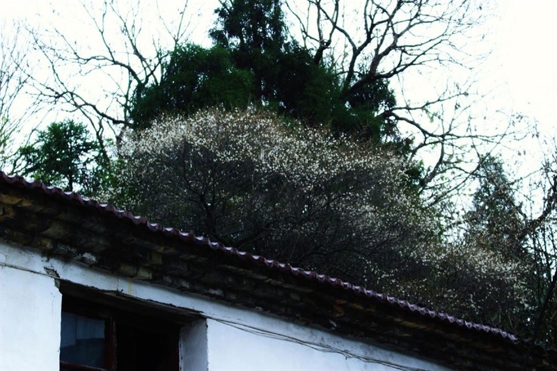 从寺院出来,寺院后山上也有一丛白梅已经盛开,这丛白梅依靠着后山的屋子,像是犹抱琵琶半遮面的感觉。想起王冕那首《白梅》:“冰雪林中著此身,不同桃李混芳尘,忽然一夜清香发,散作乾坤万里春。”