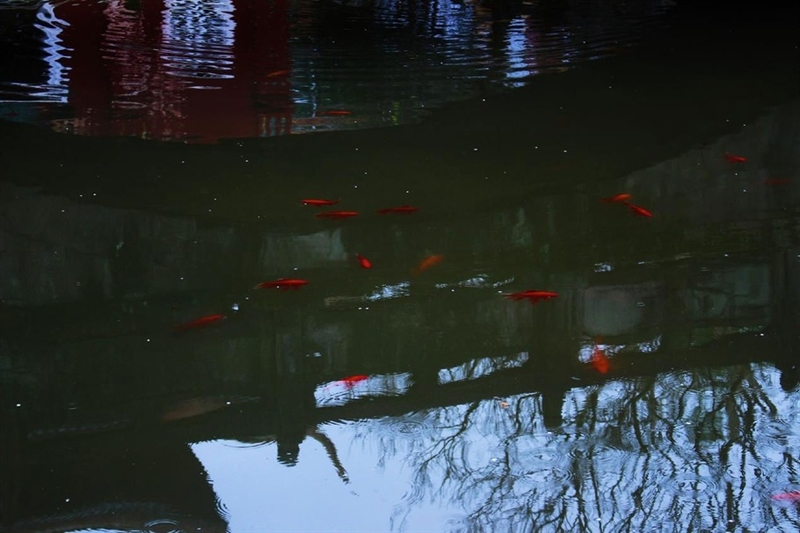 梅花的花瓣飘落又落到了放生池里,池水浮起一片涟漪,池中的红色鲤鱼也悠闲的在水里浮动着,时而拨弄着飘落下的花瓣。石桥、枯树、古庙倒映在池水中,条条红鱼就像在画中游动一般,如梦如幻,如痴如醉。想起那句“最爱芳香何处,花落菩提深深,随缘即应,落花潋滟”兴许就是这般场景。