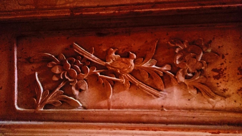 通往三楼的木质楼梯细窄,只能勉强通过一个人,楼梯两侧的红色墙壁上,也满是精美的雕花,雕花主要采用浮雕的方式,有喜鹊登枝、花开富贵等传统的富有寓意的吉祥图案。